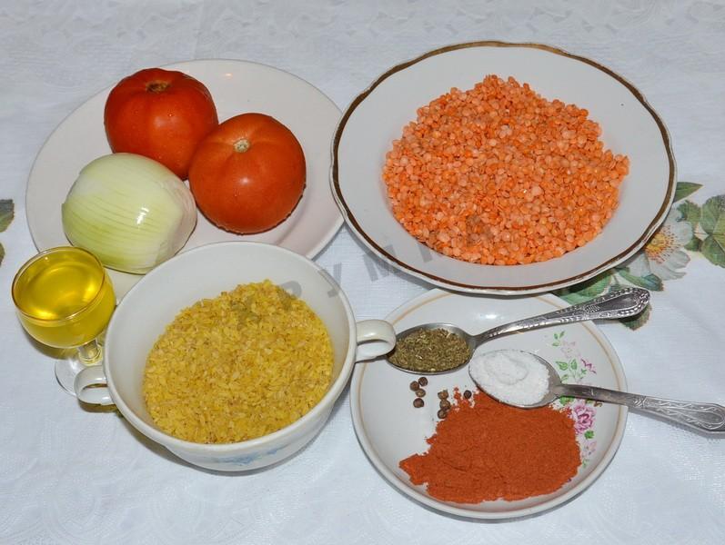 Продукты для приготовления Турецкого супа с булгуром. Красная чечевица и булугур промыты (хотя, встречала информацию, что булугур не нужно промывать, но я рискнула), репчатый лук очищен, он и помидоры помыты.