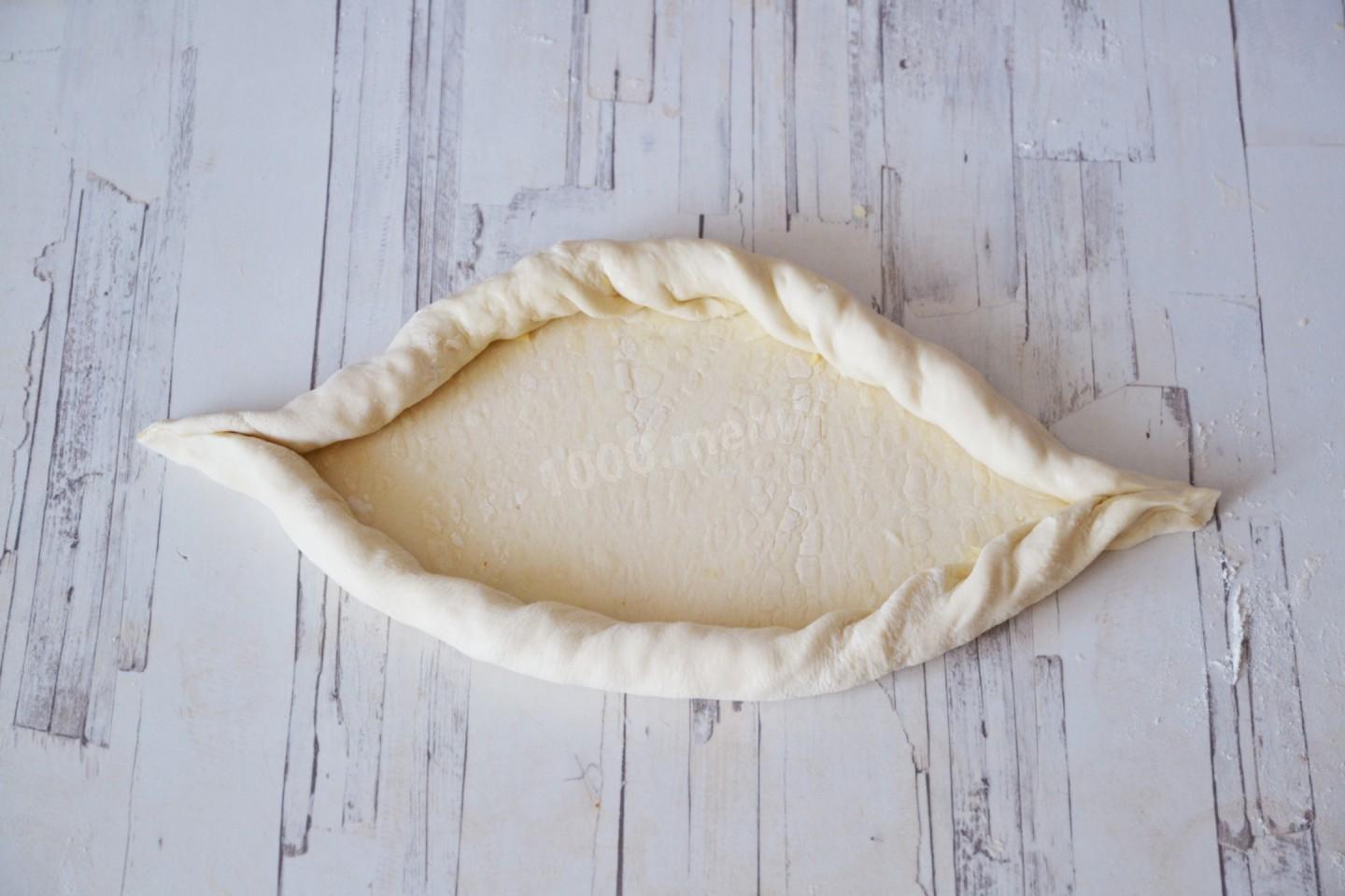 Сверните стороны с сыром навстречу друг к другу, формируя лодочку. Сыр окажется внутри бортиков хачапури.