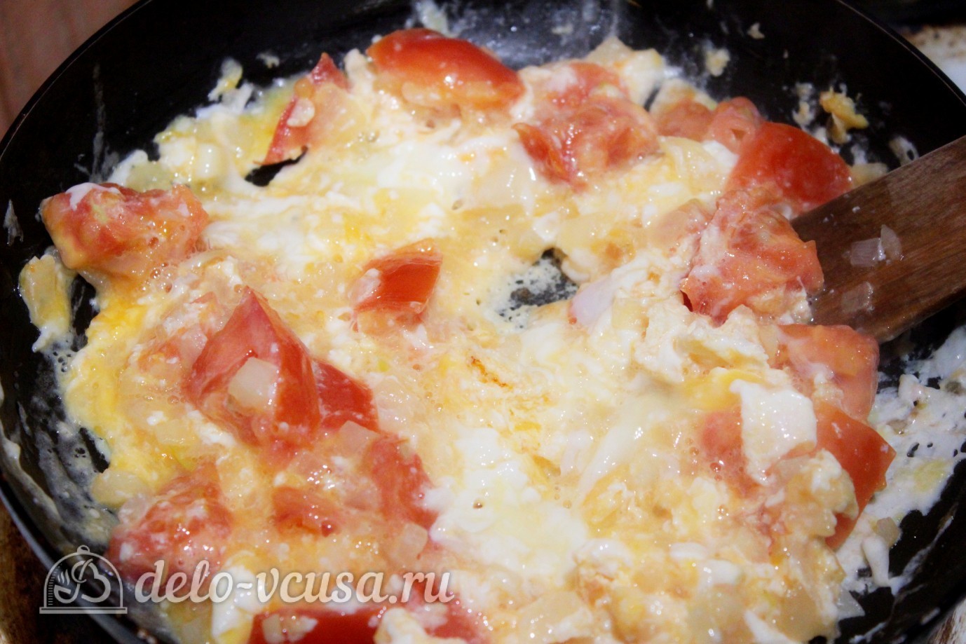 Ссылка на оригинал рецепта: Яичница с помидорами и луком на delo-vcusa.ru