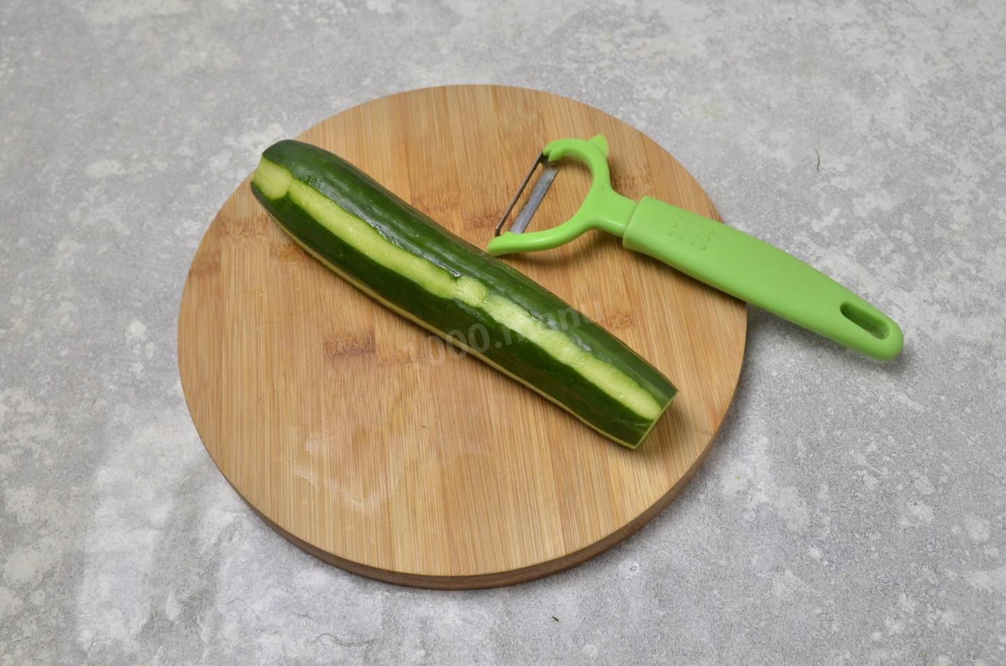Для другого вида закуски снимите с огурца тонкие полоски кожицы, чтобы он стал полосатым. Удобно сделать это овощечисткой.