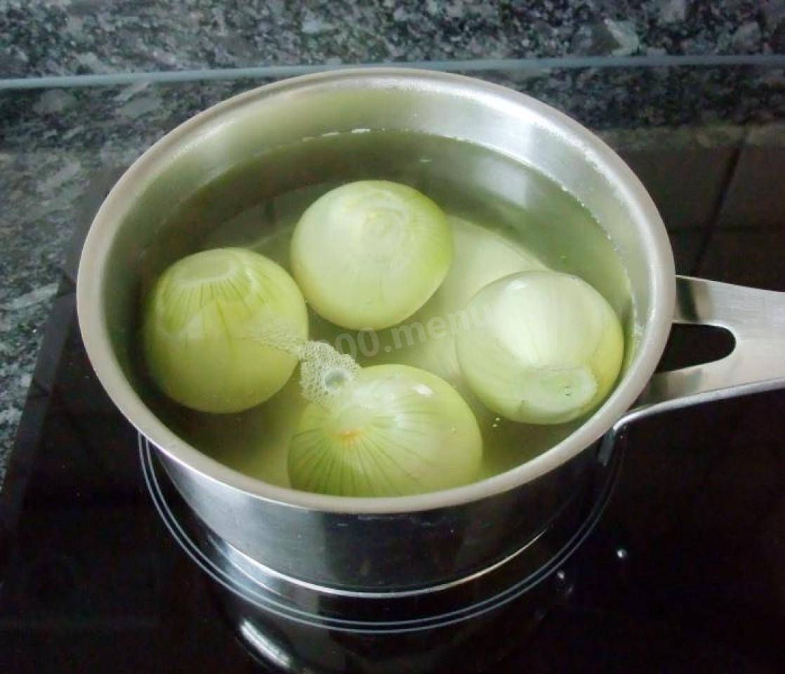 Затем кладем лук в кипящую воду минут на 10, чтобы он стал немного мягким, после чего перекладываем его в дуршлаг для стекания воды и остывания.